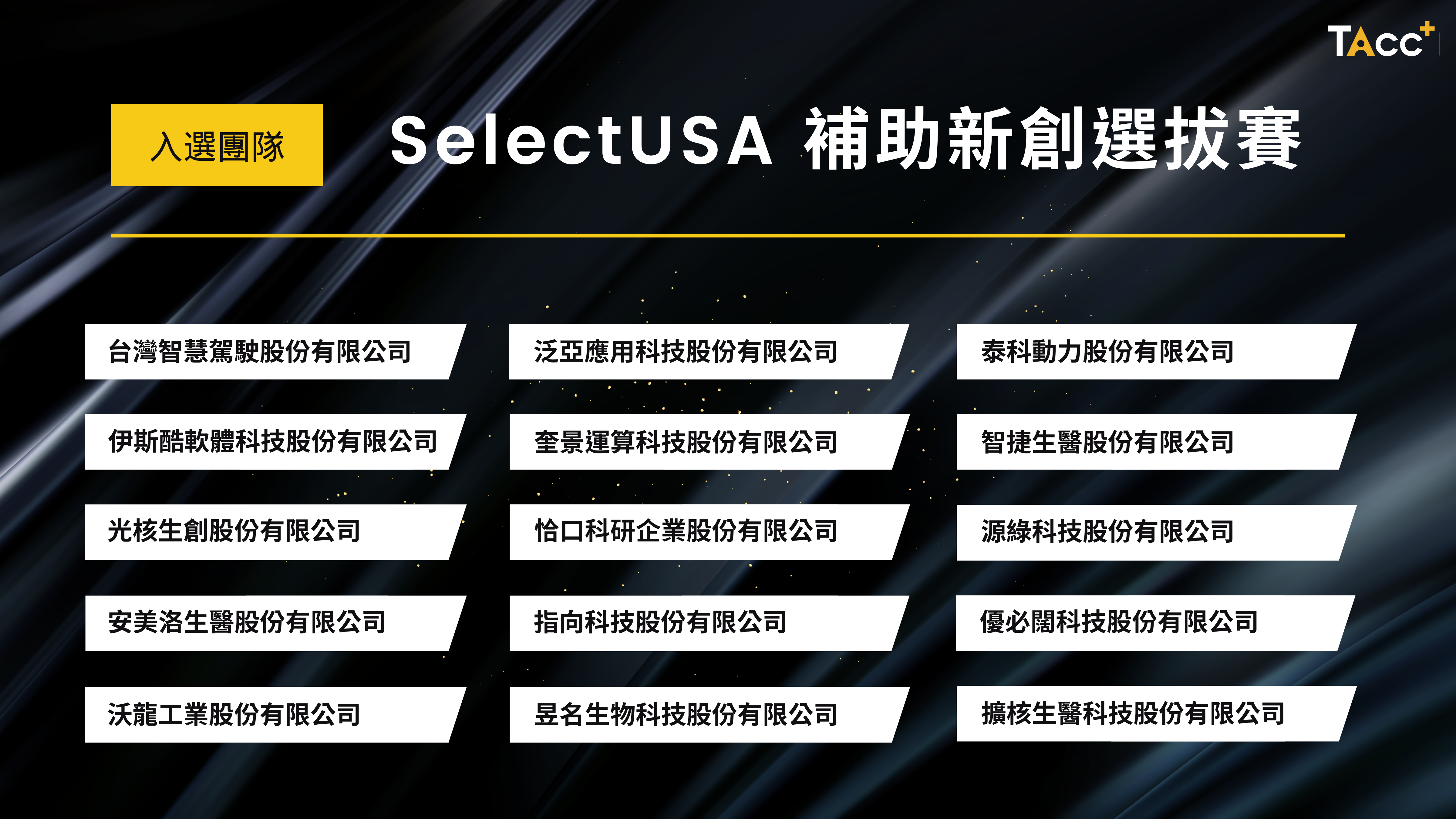 感謝各位優秀的新創報名參加!以下是 SelectUSA 補助新創選拔賽的入選、備選團隊。TAcc+ 感謝各位新創夥伴的努力,以及所有新創生態系夥伴的支持!🤝