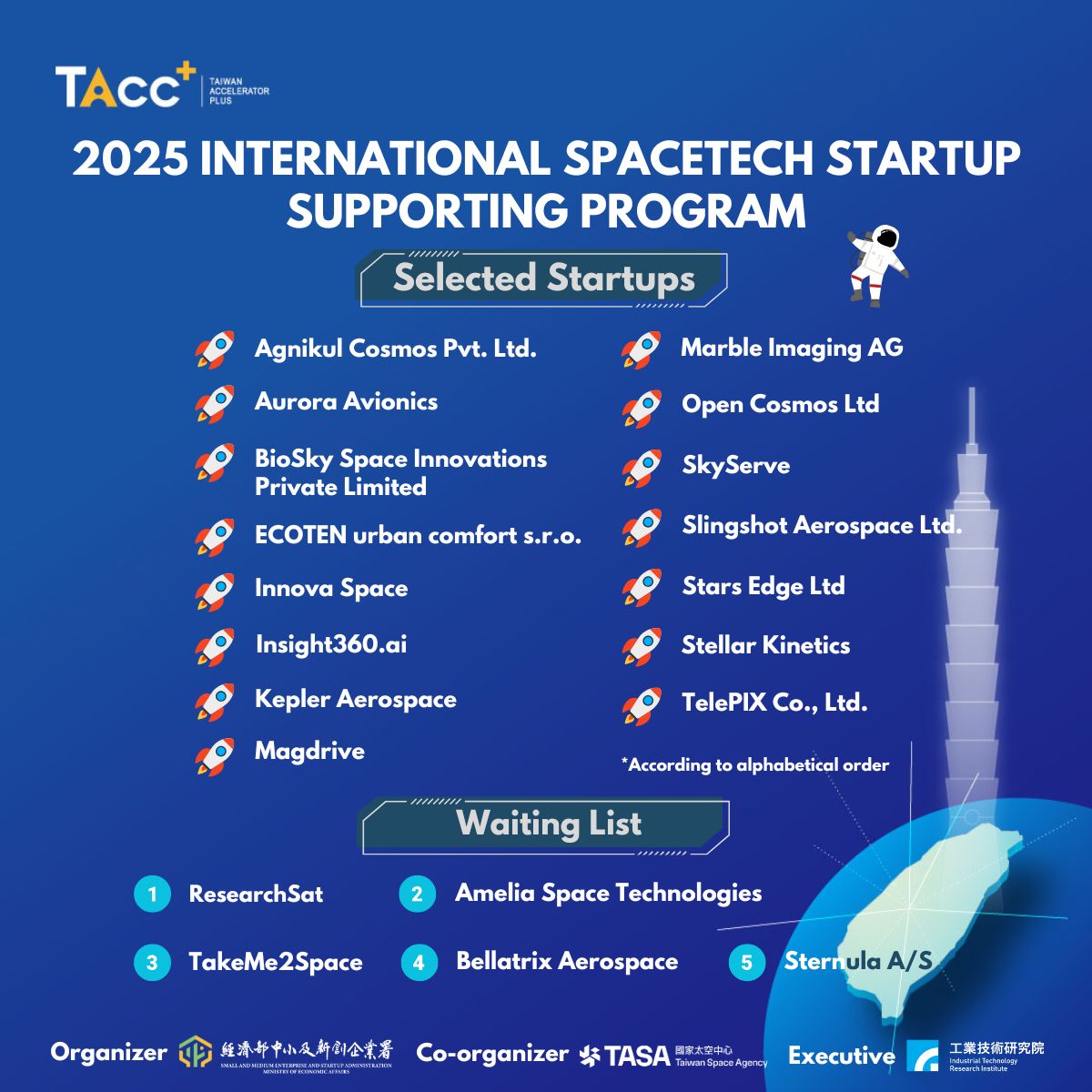 感謝來自世界各地的優秀新創企業報名參加,此次競爭非常激烈!我們很榮幸地宣布以上新創成功入選《國際太空新創來臺落地培訓計畫》,獲得包含臺灣太空產業關鍵企業產創共創、一個月基礎落地服務等資源!也非常感謝所有新創夥伴的支持和參與。