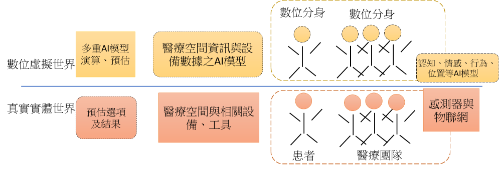 欲建立醫療系統的多重代理系統,達到真正一模一樣相同的Digital Twins模擬效果,勢必要涵蓋許多AI模型演算的資料巨集,包括患者生命監測設備的健康數據、救護車輛、醫院建築物、醫療人員、患者位置、動態等資訊。據此,Digital Twins亦能預估組織管理層級的牽一髮動全身之連動,計算多層次、多重AI模型間的互動反應,表現真實世界系統層次之間交互作用後的最終結果。