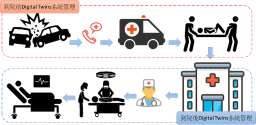 外傷緊急照護流程,與院前院後的Digital Twins管理概念示意圖