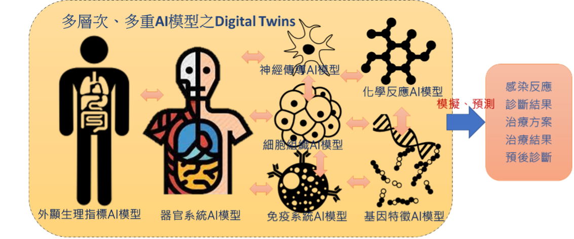 由於個體不同身心層次之間是相互關聯、影響,我們可以建立「多重AI模型」模擬各自的反應,與之間的交互作用:在次細胞層次方面,以巨噬細胞基因組學數據分析,模擬各種巨噬細胞亞型的高表達基因交互作用的動態網絡模型;多細胞規模上,以影像資料觀察免疫反應變化;組織層次方面,觀察與模擬肺泡囊的免疫反應變化;器官規模的免疫反應,建立流體力學模型模擬肺部空氣流動;在人體層次上,透過感測器的多元數據 (例如呼吸、腦部血流等) 計算器官系統間反應。其他還有藥物動力學模型、病毒傳播模型、生理或特定器官之模型 (例如血液、淋巴的流動計算) 等。藉由由下而上的數據蒐集,建立多重AI預測模型,模型間的交叉驗證、整合,即時、連續的實徵資料回饋,產出「牽一髮動全身」的最適化Digital Twins。
