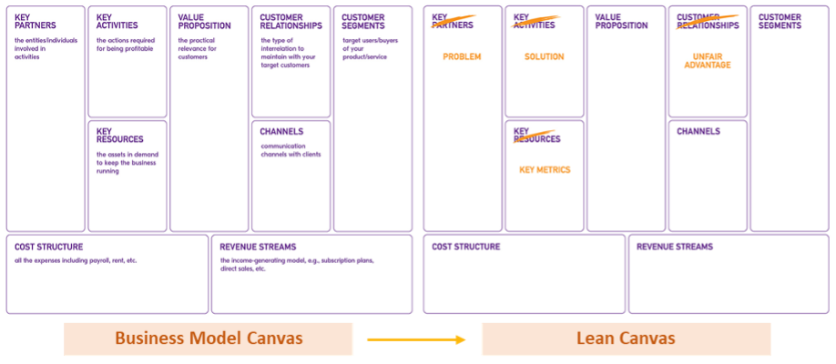 若以「商業模式畫布(Business Model Canvas)」與「精實畫布(Lean Canvas)」的比較為例—有許多創業家尚不清楚其中真正的差異(請參見圖一),商業模式畫布(Business Model Canvas)出現較早,由知名商業模式理論家Alex Osterwalder 所創建;後來創業家Ash Maurya根據實際創業遇到的狀況和風險提出改版—即「精實畫布(Lean Canvas)」。