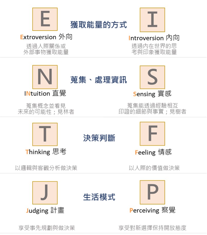 MBTI 測驗以四個面向來解讀人類性格偏好,每個面向又有兩個相反的指標,可參考圖一。第一個面向是能量獲得途徑,分成「內向(Introversion)與外向(Extroversion)」;必須注意的是,這個指標說明的是你如何消耗和充電你的能量,與「害羞或外向」無關。如果你享受從獨處或內在世界中汲取能量、自我觀照,那你的性格可能偏向 I ;相反地,在人際互動中感覺更有活力的人、享受從外部事物獲取能量的人,是偏向 E 的。在不知道 MBTI 之前,通常 I 類型的會被認為較被動,事實上 I 的人在需要時,同樣能夠積極與外界連結,甚至更擅長經營深層關係。