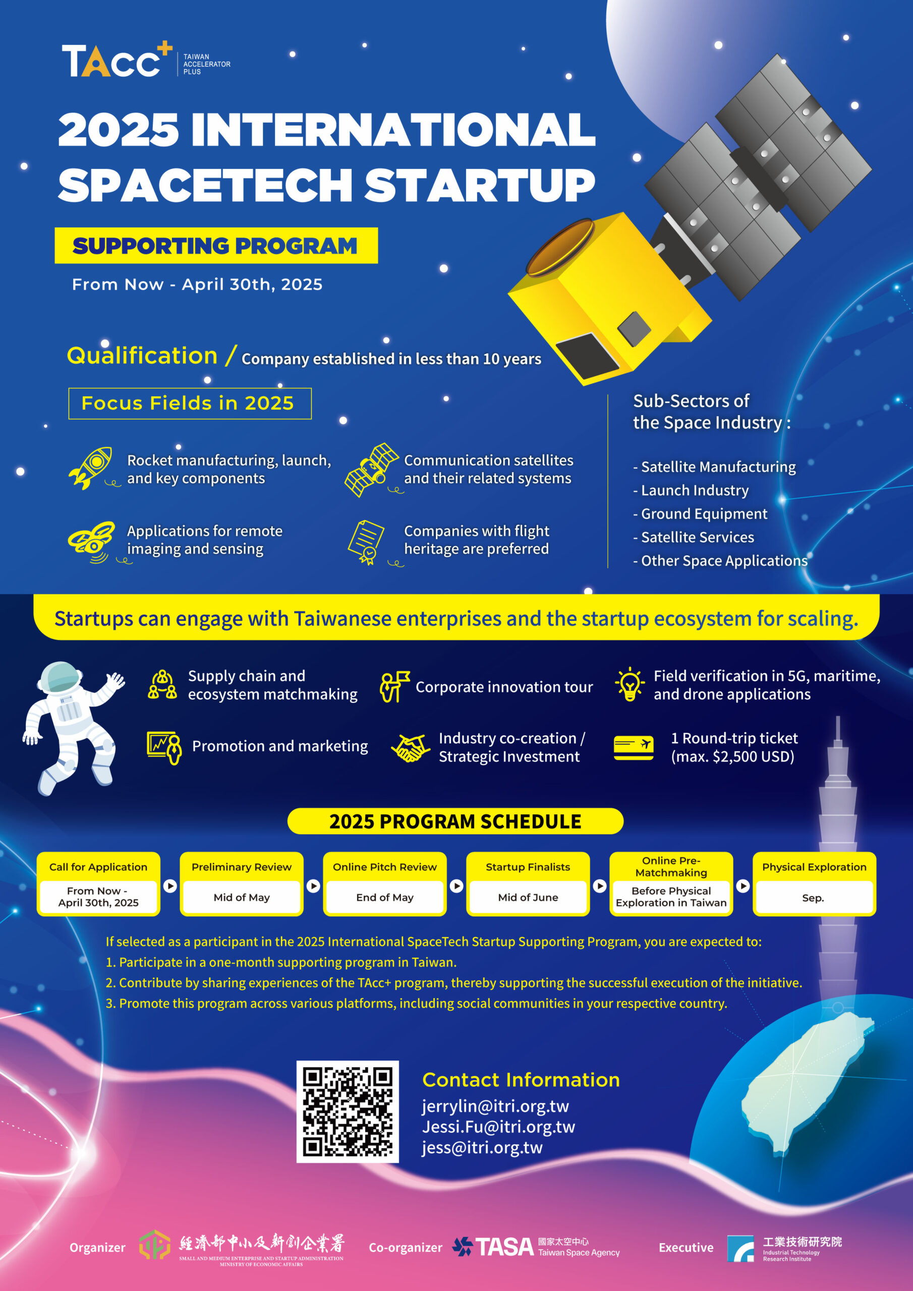 International program aims to attract global SpaceTech startups interested in the Asia-Pacific market. Within 1 month, startups can engage with Taiwan enterprises, access the supply chain, and network with the startup ecosystem for scaling.