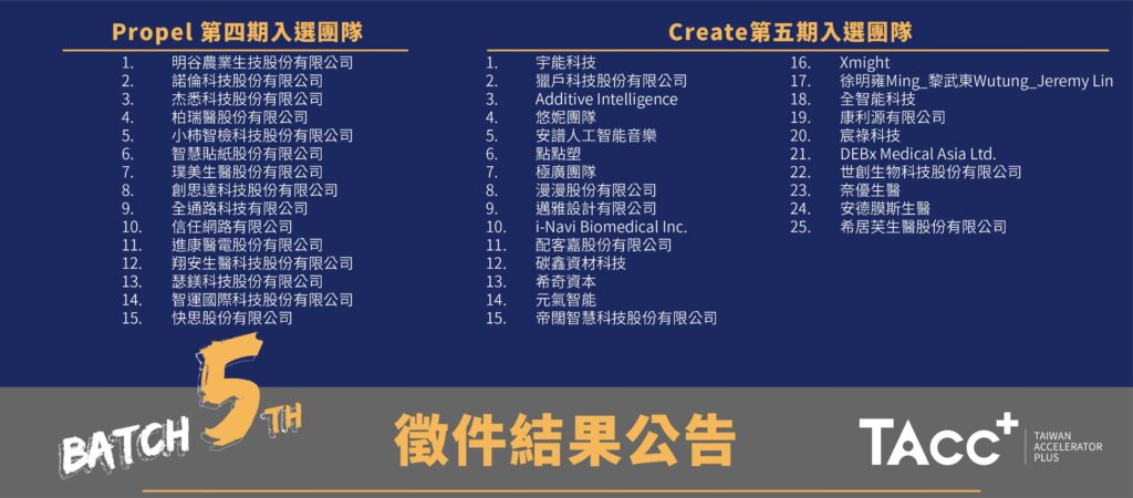 第五期TAcc+收到眾多優秀新創投件,我們很榮幸能夠邀請以下獲選團隊進入TAcc+,再次感謝各位新創夥伴的支持與參與!