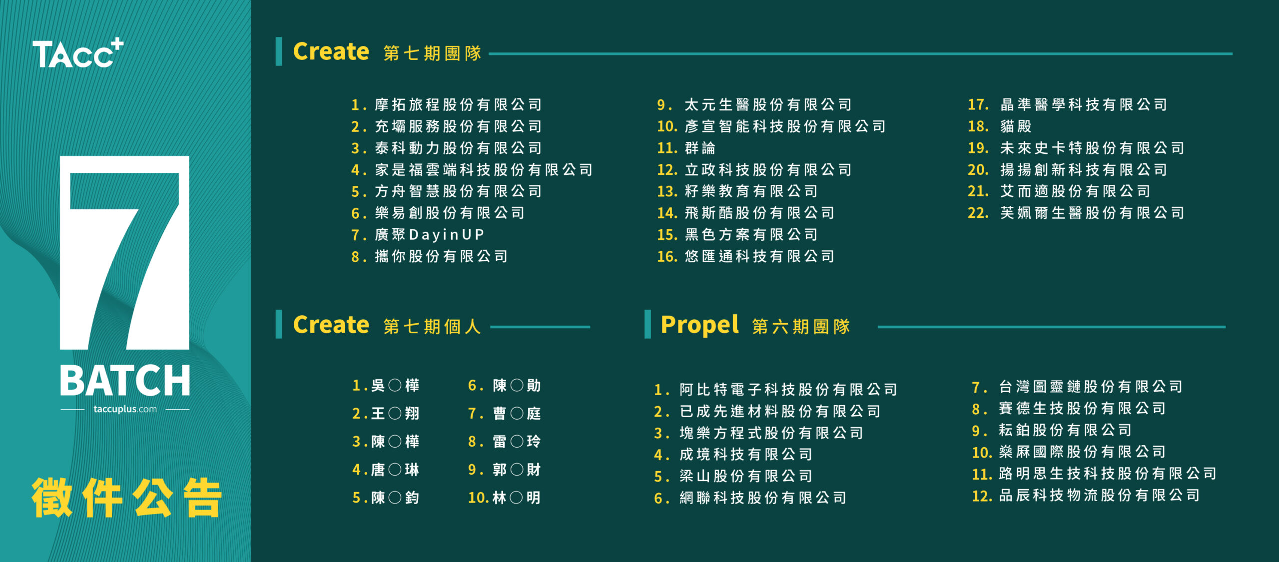 這次收到眾多優秀新創投件,我們很榮幸能夠邀請以下獲選團隊進入TAcc+,再次感謝所有新創生態系夥伴的支持與參與!