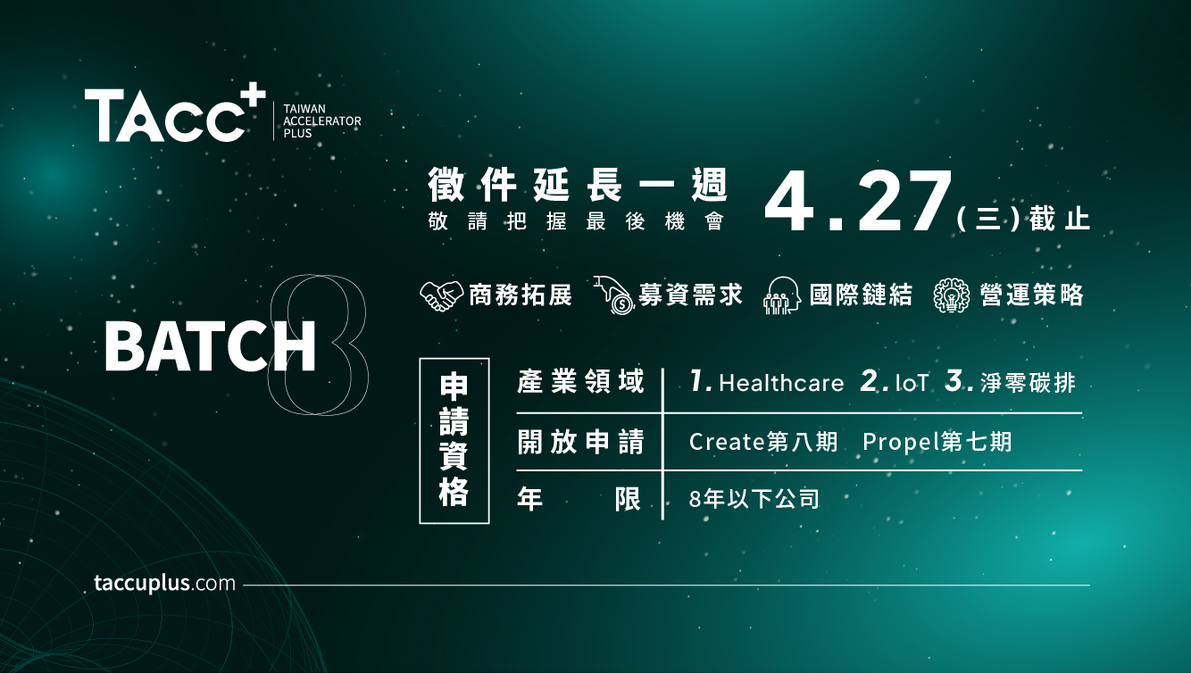 誠摯邀請,優秀的新創團隊與創業家來加入TAcc+這個大家庭!Batch #8 培訓在7月中開始,現在開啟3月第一階段徵件,Welcome to Join TAcc+!