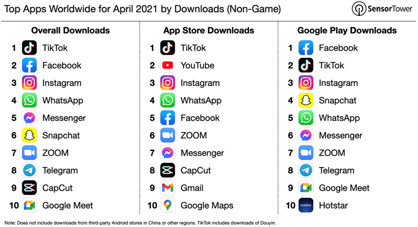 - “Top Apps Worldwide for April 2021 by Downloads,” Sensor Tower, 2021.