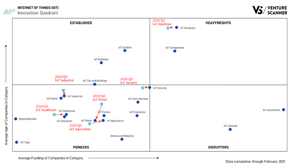 請參考圖10,根據Venture Scanner每季的IoT各領域別的資料,橫軸是平均募得的資金,縱軸則是公司經營了幾年,從過去2020年Q3的資料來比較(請參考圖10的淺藍色點),能發現到2021年Q1,工業IoT(IoT Industrial)的數值往下掉,表示在這個期間內更多公司參與在這個領域,錢只有多一點點。健康醫療IoT(IoT Healthcare),表示投入該領域的資金越來越多,公司數卻差不多,顯示該領域有成熟的新創公司,正在取得更多資金去拓展業務。零售IoT(IoT Retail),表示新加入的新創公司變多了,但錢卻變少了。農業IoT(IoT Agriculture),整體而言沒有太多新創跟資金的投入,但是從趨勢上可以看到資金有緩步的成長。資安IoT(IoT Security)所獲得的資金變多了。硬體IoT(IoT Hardware),是IoT中投資最早的,因此資金相對其他垂直行業來得多,此期間內也不斷增加投資金額。