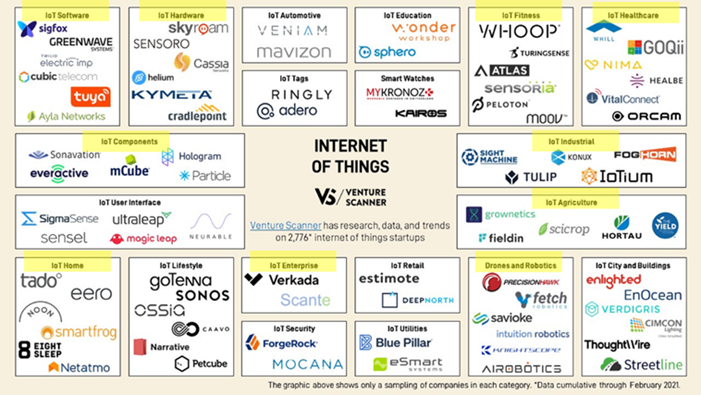 請參考圖11,根據Venture Scanner每年精選出IoT各垂直領域的領頭羊先創公司,可以看出很多新創公司投入軟體(Software)、平台(Platform),而台灣投入很多的硬體(Hardware)領域,其相關新創公司也是眾星雲集。以下就數個垂直領域進行介紹: