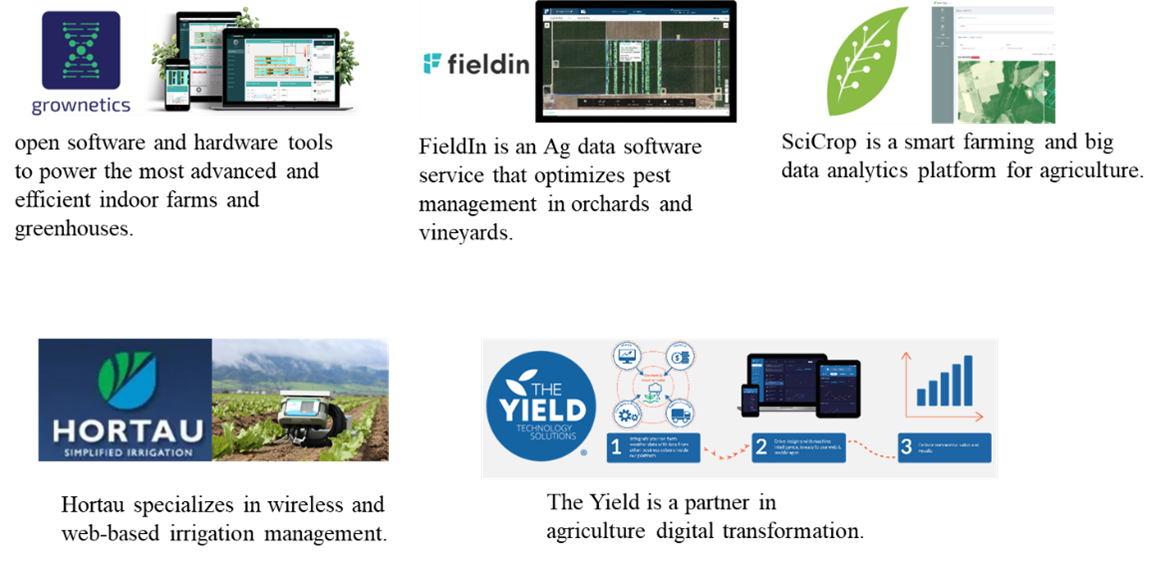 - 新創公司Fieldin:運用軟體服務,做蟲害管理系統,這個尤其應用高單位農作物上。