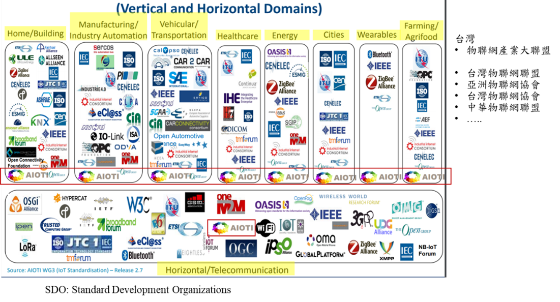 垂直領域可以看成不同行業的聯盟,例如上述提到的IIoT、Healthcare IoT、Home IoT、Transportation IoT等。而水平領域指的是不同各領域都會用到的關鍵技術,如通訊(Telecommunication)、零組件(Components)規格等。
