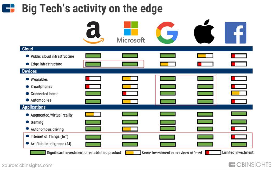 整體而言,邊緣運算的市值達到$5,500 Billion,科技巨頭如FAMGA(Facebook、Amazon、Microsoft、Google、Apple)都在該領域投資大量的資金,其中在邊緣基礎建設(Edge Infrastructure)投入最多的當屬Microsoft及Amazon。請參考圖2。