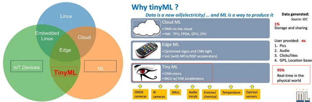 定義上TinyML是將機器學習運用在物聯網終端設備 (包含智慧監視器、可穿戴設備,及感測器等) 的微控制器上,令IoT終端設備只需要超低功耗 (mW級別),期待能夠「主動」進行機器學習,並參與智慧決策與執行。也就是說,TinyML優勢在於提升物聯網終端設備的數據分析和決策能力。
