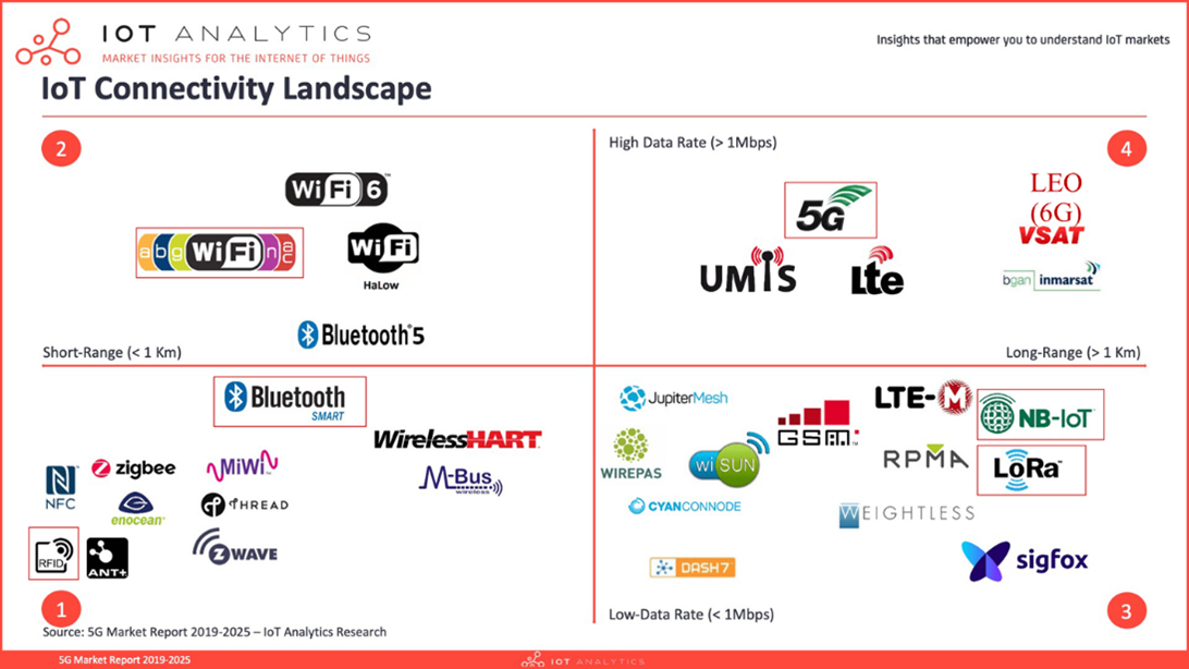 目前,有許多種類的IoT Connectivity的方式,參考圖4,橫軸是通訊的距離,基本上,距離小於1km者,稱為短距通訊(Short Range),距離大於1km者,稱為長距通訊(Long Range);縱軸是傳輸量,大於1 Mbps稱為高速數據傳輸技術(High-Data Rate),小於1 Mbps稱為低速數據傳輸技術(Low-Data Rate)。