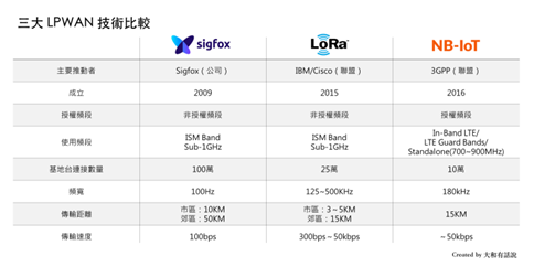 3大LPWAN技術的比較請參考圖5所示,NB-IoT屬於授權頻段(Licensed Band),而LoRa、sigfox則屬於非授權頻段(Unlicensed Band)。