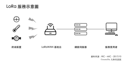 請參考圖6,LoRa的服務為很直觀,首先各式各樣的終端裝置將訊號傳給LoRaWAN基地台,該基地台能夠透過網路伺服器來服務使用者。