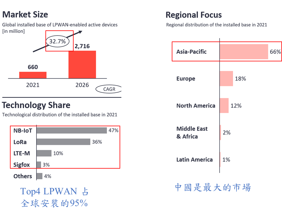 從市場面來看,LPWAN由於受到強大的生態系統支持(包含IoT供應商,及網路運營商),因此預計從2021年到2026年的年複合長長率將高達32.7%,市值達到$2,716 百萬元,全球LPWAN技術的四大家,佔據了全球安裝的95%,分別是剛才提及的NB-IoT占47%、LoRa占36%、LTE-M占10%,及Sigfox占3%。