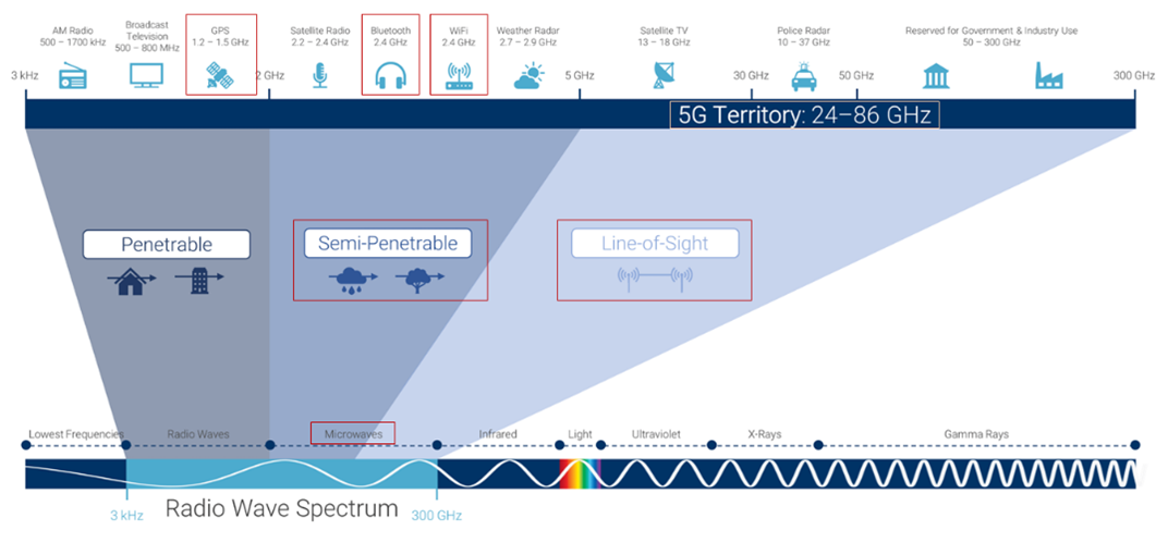 5G與其他連線方式最大的差異就是頻率,請參考圖8,根據物理定律,波長= 波速/ 頻率,若波速相同,波長和頻率成反比。GPS的頻率為1.2~1.5GHz,這也是手機的頻率,手機可以穿過屋頂牆壁,因此室內打電話沒問題的。而Radio的頻率為2.4GHz,關門可能就聽不到,Bluetooth若在有隔牆的地方,就無法發揮功效。而頻率高的5G的波長極短,請參考圖8,5G位於Line-of-Sight,此範圍屬於毫米波等級,亦即穿透力極差,這個特性,造成5G在傳輸過程中要走直線,不能彎曲,也就代表5G需要建設許多基地台來避開阻擋。詳細的說,過去我們使用的3G和4G傳訊距離皆比5G更遠,由於5G使用的頻率較高的關係,讓訊號繞過障礙物的能力不如3G和4G,但如果更密集式的架設5G基地台,可以減緩這傳送範圍小的問題,原本3G和4G網路可以相距較遠地架設基地台,但由於5G網路傳送範圍小,則需要更密集地架設基地台。因此5G的佈建成本高,覆蓋同一面積5G基地台部署數量將是4G的數倍。除此之外,5G的傳輸過程中,中間不能有障礙物,如果要將5G引到屋內,就需要有許多中繼器(Repeater)來協助傳輸,在5G的室內應用上是很大的挑戰。