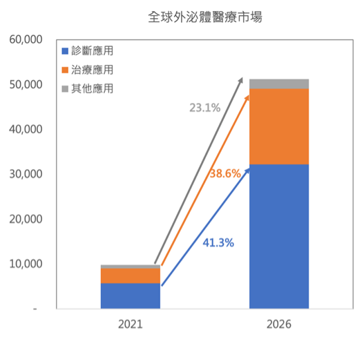 全球外泌體醫療應用市場主要分為診斷和治療兩大應用領域。根據BCC Research的統計,全球外泌體市場在2021約為9,780萬美元,預估將以年複合成長率(CAGR)39.3%的速度,在2026年達到51,260萬美元(如圖2、圖3)。